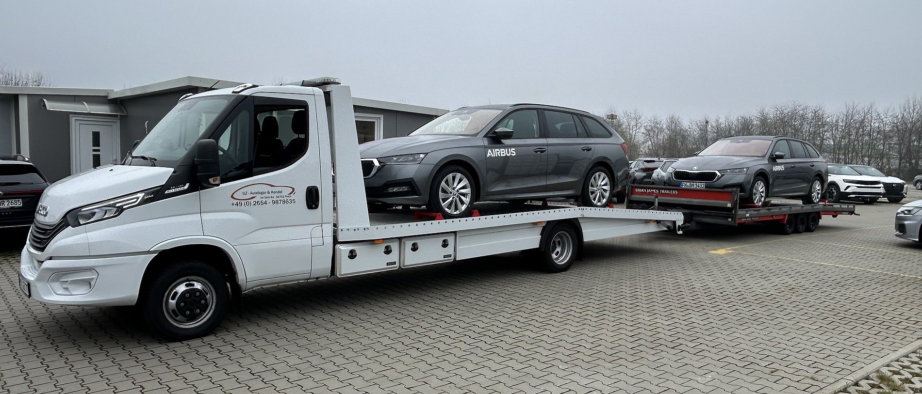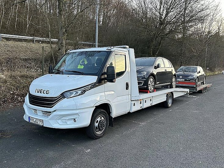 - ein Iveco Daily 50.180 Hi Matic Fahrzeugtransporter Erstzulassung: 01/2024 mit Luftfederung und einer E-Winde (Plattformmasse L 6,20 m x B 2,10 m Nutzlast: von 2.700 KG) basierend auf einem Radstand von 4750 mm und einem 5,2t Fahrgestell